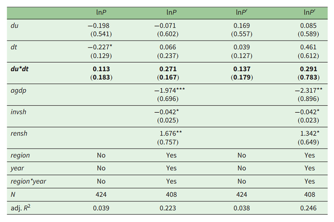 表1顯示了基準(zhǔn)回歸結(jié)果??梢钥闯龊诵淖兞縟u*dt的估計(jì)系數(shù)在統(tǒng)計(jì)上不顯著,結(jié)果無(wú)法表明地方環(huán)境立法有助于減少污染物排放。作者將污染物排放水平的對(duì)數(shù)值作為因變量,對(duì)模型進(jìn)行重新估計(jì)后,結(jié)果仍然沒(méi)有發(fā)現(xiàn)環(huán)境立法具有顯著影響。為進(jìn)一步驗(yàn)證基準(zhǔn)回歸的準(zhǔn)確性,作者使用了不同的匹配標(biāo)準(zhǔn)作為穩(wěn)健性檢驗(yàn)。首先,由于最近鄰匹配不止一次地使用一些未處理的省份作為匹配的比較組,所以作者考慮一個(gè)沒(méi)有替換的新匹配。換句話(huà)說(shuō),即每一個(gè)未經(jīng)處理的省份在某一年只使用一次。第二,由于最近鄰匹配對(duì)于每個(gè)處理過(guò)的省僅使用一個(gè)未處理組,所以作者也開(kāi)始考慮在匹配分析中使用一個(gè)以上的比較省份。此外,作者采使用許多未處理省份的加權(quán)平均值(取決于核函數(shù)的選擇)作為研究的比較組。結(jié)果表明,所有上述穩(wěn)健性檢查未能支持地方立法的監(jiān)管效果,這證實(shí)了文中在基線(xiàn)DID回歸中的主要發(fā)現(xiàn)的有效性。